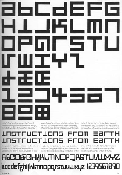 Today, Momus waxes nostalgic about the long-defunct UK publication 'Design.' One of his readers points to an on-line archive that includes pages scans as well as searchable HTML text. Gotta love the web. Below, an illustration from an article on human/machine-readable typography - from February 1969 - the month I was born!