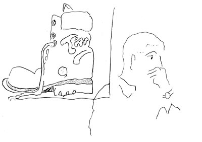 Sometime last year Frank Day gave me a stack of CDs as listening homework - in that batch was an album by the Ordinaires. While in NYC a few moons back I got to meet Fritz Van Orden - sax player for the Ordinaires, Glenn Branca, TMBG, etc. - check out his drawings, listen to more CDs, eat carrots, and be regaled. Below is a sample of Fritz's cultural commentary, via FD: