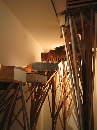 I've heard good stuff about John Watson's work, but hadn't seen it until today - an installation in the micro-space at Hemphill. 1) it is the subsconscious of the Cushner painting that it is 'inside of'; and 2) he correctly predicts the future in a way that artists like Sarah Sze don't: it's not gonna be plastic, neo-Tokyo blobject design, it's gonna be folktronica lumber and yarn reorganized in interesting ways by a wireless net of embedded RFIDs. Speaking of Hemphill, George has prophesized that the form and function of art will change radically over the next 100 years. This is the future of painted pictures: