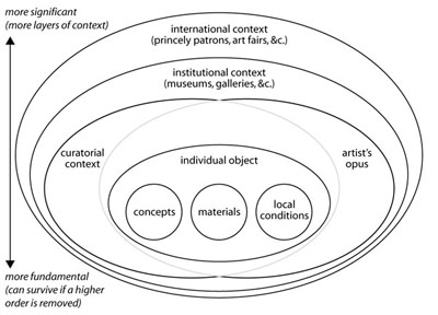 I ran into Tyler on Monday morning and we chatted briefly about The Uncertainty of Objects and Ideas at the Hirshhorn. Later, in a fit of delerium [I have a lingering cold that's really punishing me] I elaborated in a long-ish email, complete with Haliburton-style PowerPoint info-graphic. I've been mulling over our conversation today. I'm sure I sounded glib, but I've been really thinking it through and stand by my position that the show is worth seeing because of the strength of the individual pieces, regardless of curatorial stance [or lack thereof.] As a practitioner, my primary concern is whether or not the work can inform my process. A general viewer should be looking at individual pieces to see if they pose worthwhile questions. [Hence the strength of the idea of 'uncertainty.' Work that makes assertions, rather than poses questions, is in my mind either illustration, at it's best, or propaganda, at it's worst.] So, while curatorial and institutional context is important, it remains secondary to the individual pieces. To dismiss the work because of the context is in my mind akin to writing off a dissident intellectual who happens to live in a fascist state. For example: the Richter show was painfully crowded in the last couple of rooms. But regardless of that, I looked at each piece and extrapolated my own context. Besides, not every show can be Sugimoto. The proof of the fundamental nature of the work lies in the fact that if you take away the individual pieces, the institutions will go away; whereas, if you take away museums, the art goes on. Yes, curators, institutions, and 'international discourse' add layers of context, meaning and significance; however I think [for the moment at least] that the added significance gives diminishing returns as one goes farther up the hierarchy.